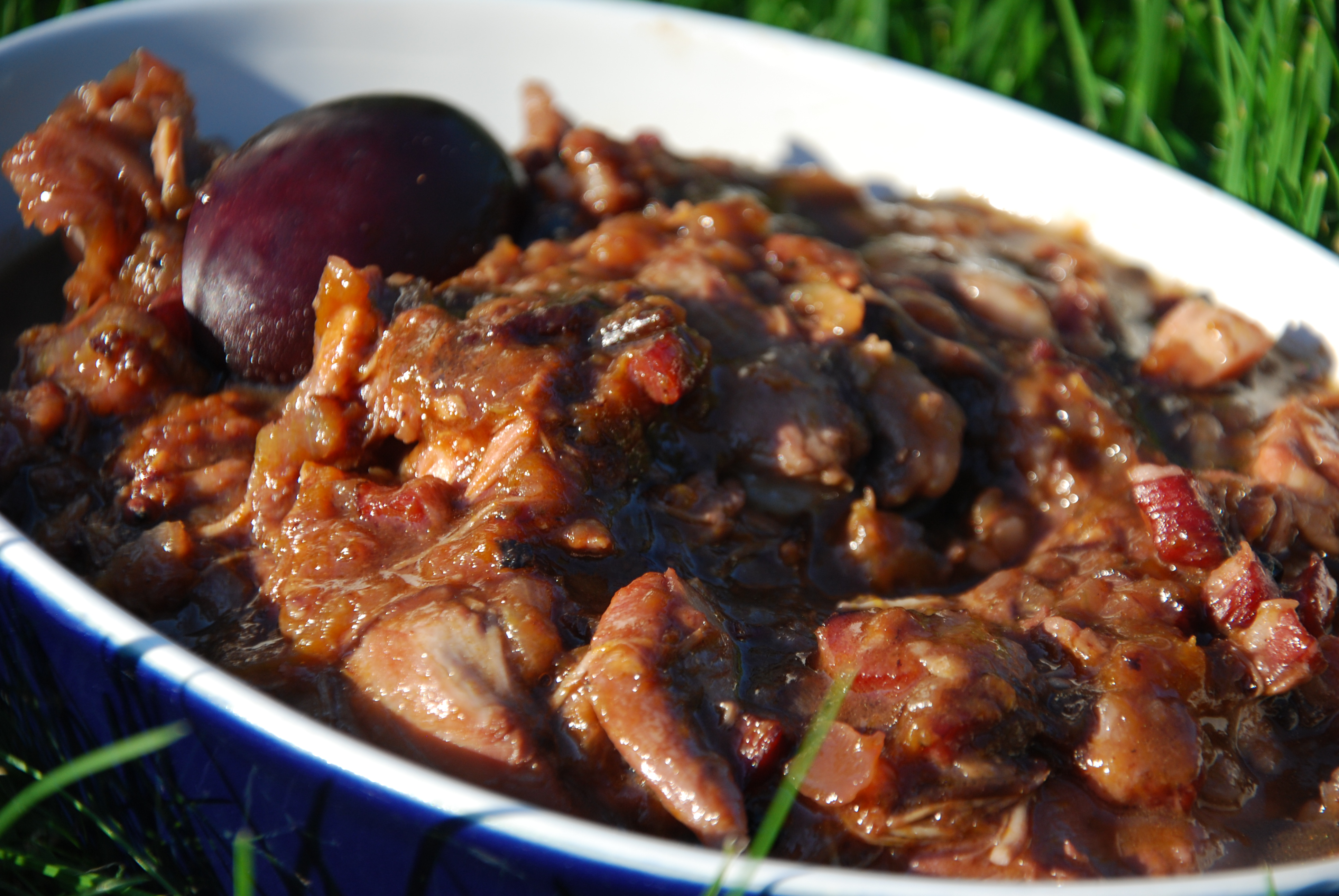 Boczek kroimy na kawałki, wrzucamy na zimną patelnię, pod którą zapalamy bardzo mały płomień. Wysmażamy boczek mieszając od czasu do czasu, aby wytopił się tłuszcz. Udka myjemy, zdejmujemy skórę. Można oddzielić górną i dolną część udek przecinając je w połowie (jakby „w kolanie”). Na wytopiony tłuszcz wrzucamy mięso, cebule pokrojone w pióro i posiekany czosnek. Smażymy 5 minut. Dodajemy przekrojone na pół śliwki i powidła, zalewamy winem i bulionem/wodą. Solimy i pieprzymy. Gotujemy na wolnym ogniu pod przykrywką przez 30 – 40 minut aż mięso zmięknie. Jeśli sos jest za rzadki, wyciągamy mięso i gotujemy na większym ogniu sam sos, aby się zredukował i zgęstniał. Dorzucamy mięso, podgrzewamy i podajemy.