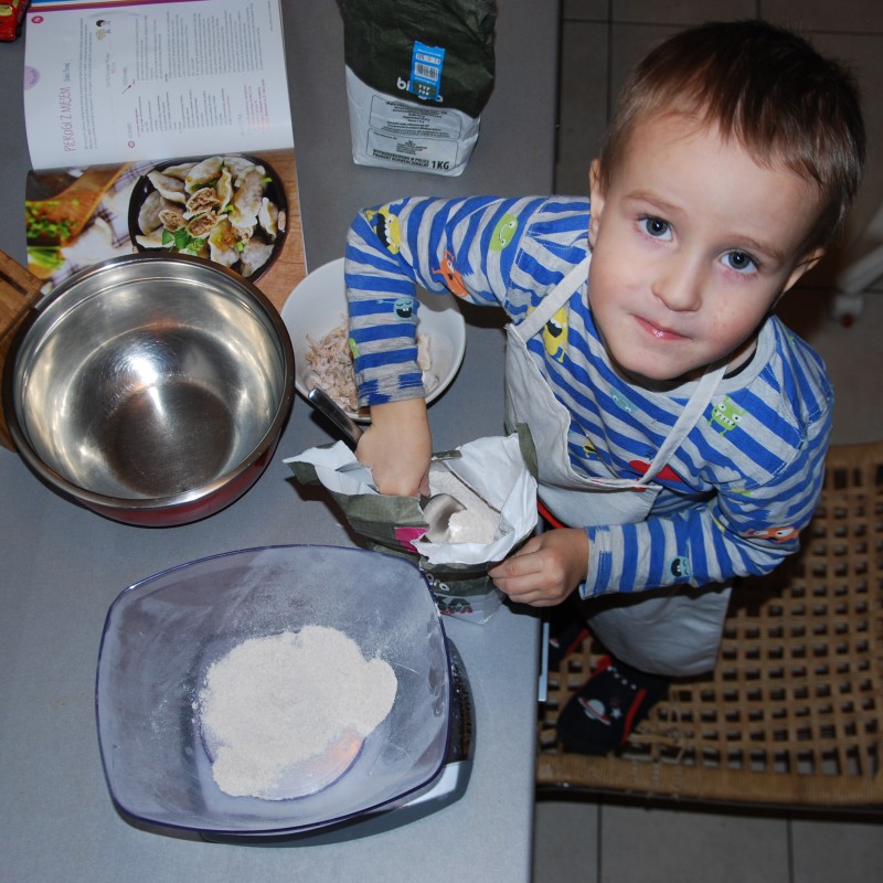 Na początku września Antek poszedł do przedszkola i już po dwóch dniach był chory. Dwa tygodnie w domu, kilka znowu w przedszkolu, znowu dom i tak na zmianę. Okresy przedszkolne są znacznie krótsze od tych domowych. Wiem, że KIEDYŚ będzie lepiej, ale TERAZ siedzimy ciągle w domu. Bawimy się lego (nie lubię), autami (nie lubię), rysujemy i malujemy (lubię), czytamy książki (bardzo lubię) i spędzamy czas w kuchni (uwielbiam). Piekliśmy już ciasteczka, ciasto bananowe, a dzisiaj, po raz drugi, robiliśmy pierogi. Dla Antka z mięsem (indyk z rosołu potraktowany jedynie blenderem), dla nas ze śliwkami. Byłam w szoku, że kawałek ciasta zajął Antka na ponad godzinę. Zdążyłam zrobić 24 pierogi nadziewane mięsem i 29 ze śliwką, posprzątać, a on lepił z ciasta kiełbasę, chleb, placek, torebkę…Było świetnie, ale cieszy mnie, że jutro idzie do przedszkola :-)