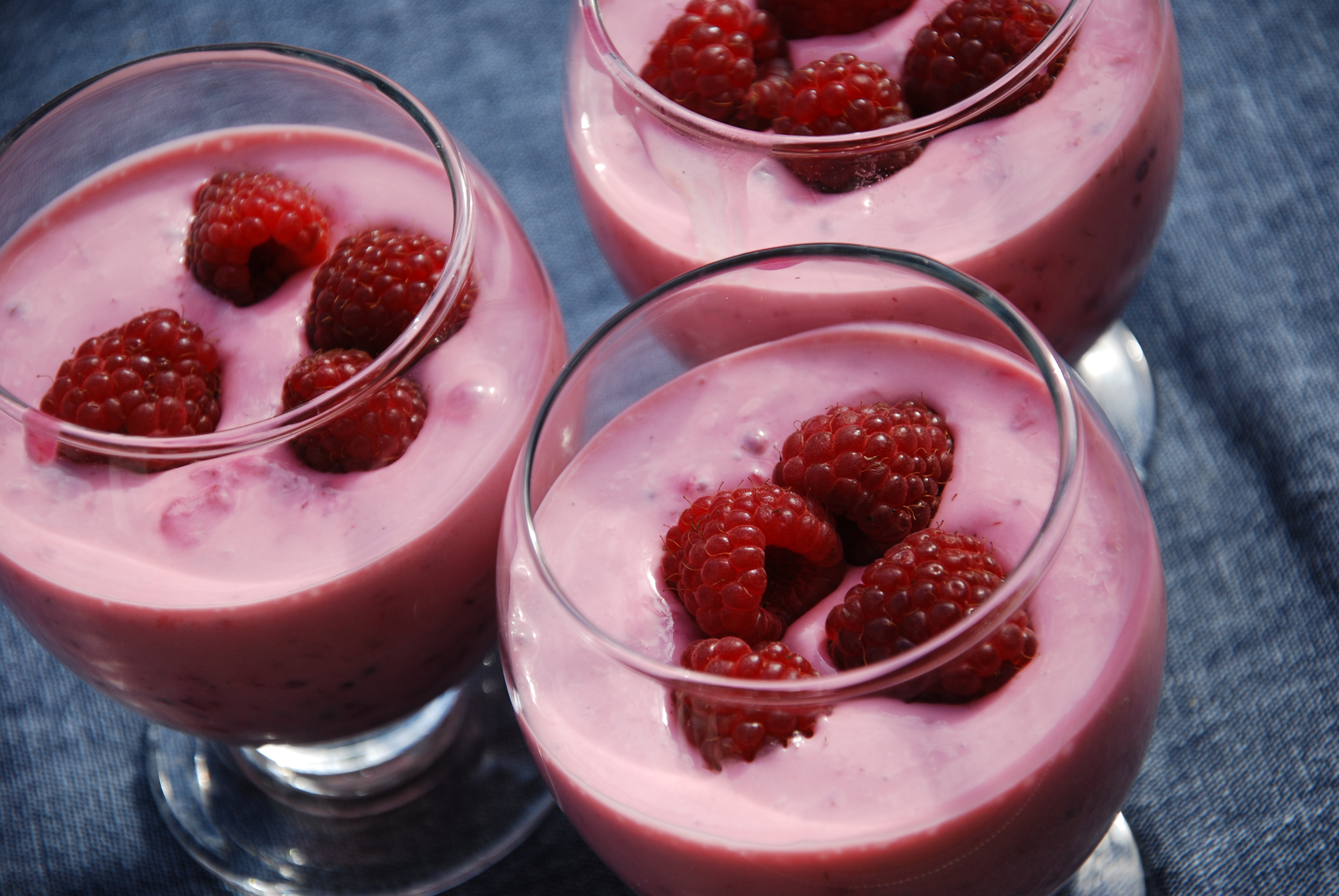 Maliny podusić widelcem, wymieszać z cukrem (kilka zachować do podania), zostawić na 10 minut. Śmietanę przełożyć do miski i stopniowo dodawać jogurt, mieszając wszystko delikatnie trzepaczką balonową. Dodać maliny, delikatnie wymieszać. Przełożyć do miseczek lub pucharków i schłodzić. Podawać udekorowane malinami.