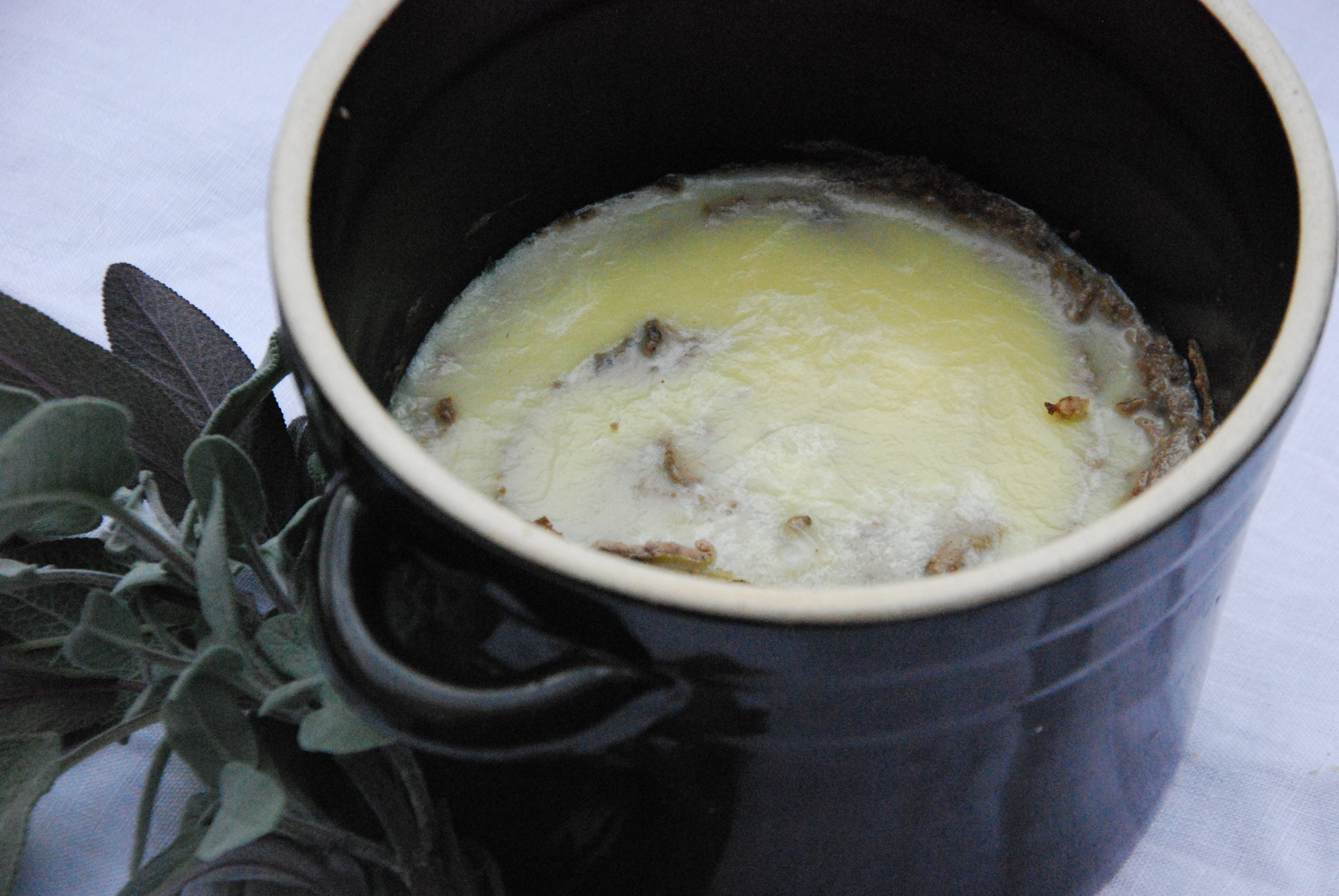 Na patelni rozgrzewamy olej, wrzucamy posiekane cebule i czosnek, dusimy kilka minut. Przekładamy na talerz, wycieramy patelnię ręcznikiem papierowym (ma mojej patelni wątróbka zaczęła się za bardzo przysmażać, więc wlałam nieco tłuszczu ze smażenia cebuli). Wrzucamy pokrojoną wątróbkę i liście szałwii, smażymy na dużym ogniu kilka minut mieszając, aby się nie przypaliło. Wlewamy brandy, zapalamy ją (UWAGA) i smażymy jeszcze minutę. Przekładamy do miski, dodajemy cebulę i czosnek, przyprawy i miękkie masło. Wszystko miksujemy, przekładamy do miseczki, schładzamy. Polewamy rozpuszczonym i nieco przestudzonym masłem klarowanym. Po wystudzeniu przechowujemy w lodówce.