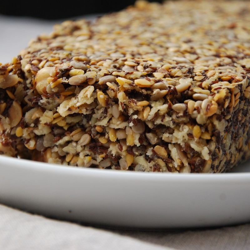 Do miski wsypać wszystkie ziarna (orzechy lub migdały przesiekać), sól i dobrze wymieszać. Jeśli używa się orzechów laskowych, to można je wcześniej podpiec ok 20 minut w piekarniku w 180 stopniach, są znacznie lepsze. Do dzbanka z wodą dodać roztopiony olej i syrop. Wlać wszystko do miski z ziarnami i dokładnie wymieszać. Jeśli masa jest zbyt gęsta, żeby mieszać, dodać 1-2 łyżki wody. Przełożyć masę do foremki, KONIECZNIE wyłożonej papierem do pieczenia. Zostawić na przynajmniej 3 godziny, najlepiej na noc. Piec najpierw 20 minut w temperaturze 180 stopni. Po tym czasie wyjąć z piekarnika i bardzo ostrożnie wyciągnąć z foremki. Położyć na kratce do góry nogami, bez papieru i piec jeszcze 30-40 minut. Przed pokrojeniem zupełnie go wystudzić. Ciepły mocno się rozpada. Zimny podobno nie powinien, choć moje doświadczenia są inne. Można przechowywać go do 5 dni w pudełku w lodówce, chociaż ja trzymałam w temperaturze pokojowej, nakryty.