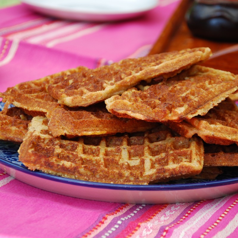 To prawda, że z publikowaniem wpisów ostatnio nie najlepiej. Ostatnio czyli już kilka miesięcy. Mogłabym pisać, że nie mam czasu, bo tyle się dzieje (a dzieje się), ale prawda jest taka, że nie miałam do tego weny. Gotuję i piekę na potęgę, ale nie mogłam się zmobilizować, żeby przepisy na te dania publikować. Od początku powstania bloga założyłam, że piszę go dla przyjemności i nic nie muszę. Nie podjęłam żadnej komercyjnej współpracy, więc nie jestem zobligowana żadnymi umowami. Jeśli mi w sercu gra – piszę, jeśli nie – po prostu tego nie robię. Coś jednak dzisiaj w sercu mym drgnęło i zatęskniłam za pisaniem. Z tej okazji podzielę się nowym, kolejnym przepisem na gofry. Są słodkie słodyczą bananów, wiórków kokosowych i mleka owsianego. Oczywiście można je czymś dosłodzić, ale dla nas były wystarczająco słodkie. Bardzo nam smakowały. Antek zjadł suche, ja nałożyłam sobie domowy mus jabłkowy i maliny, które zaprawiłam miesiąc temu. W konsystencji są nieco gumowate a nie kruche, ale w niczym to nie przeszkadza. Wchodzą na stałe do porannego jadłospisu. Przepis, z moimi zmianami, pochodzi z książki „Dzień dobry. Śniadania z Małgosią Mintą”.